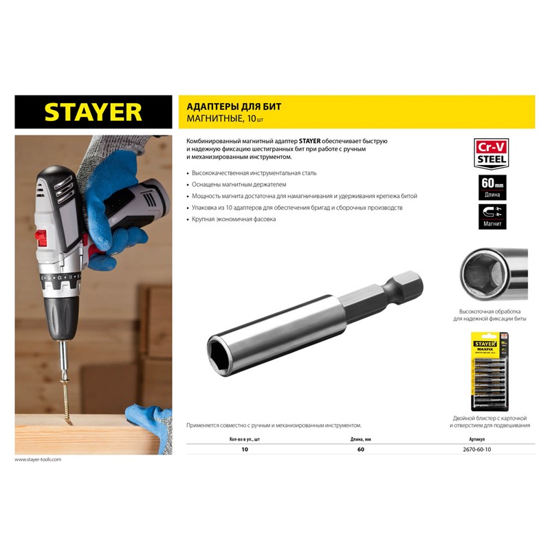 Адаптер для бит STAYER 2670-60-10, применяется совместно с ручным и механизированным инструментом. Магнитный фиксатор обеспечивает быструю и надежную фиксацию насадок.