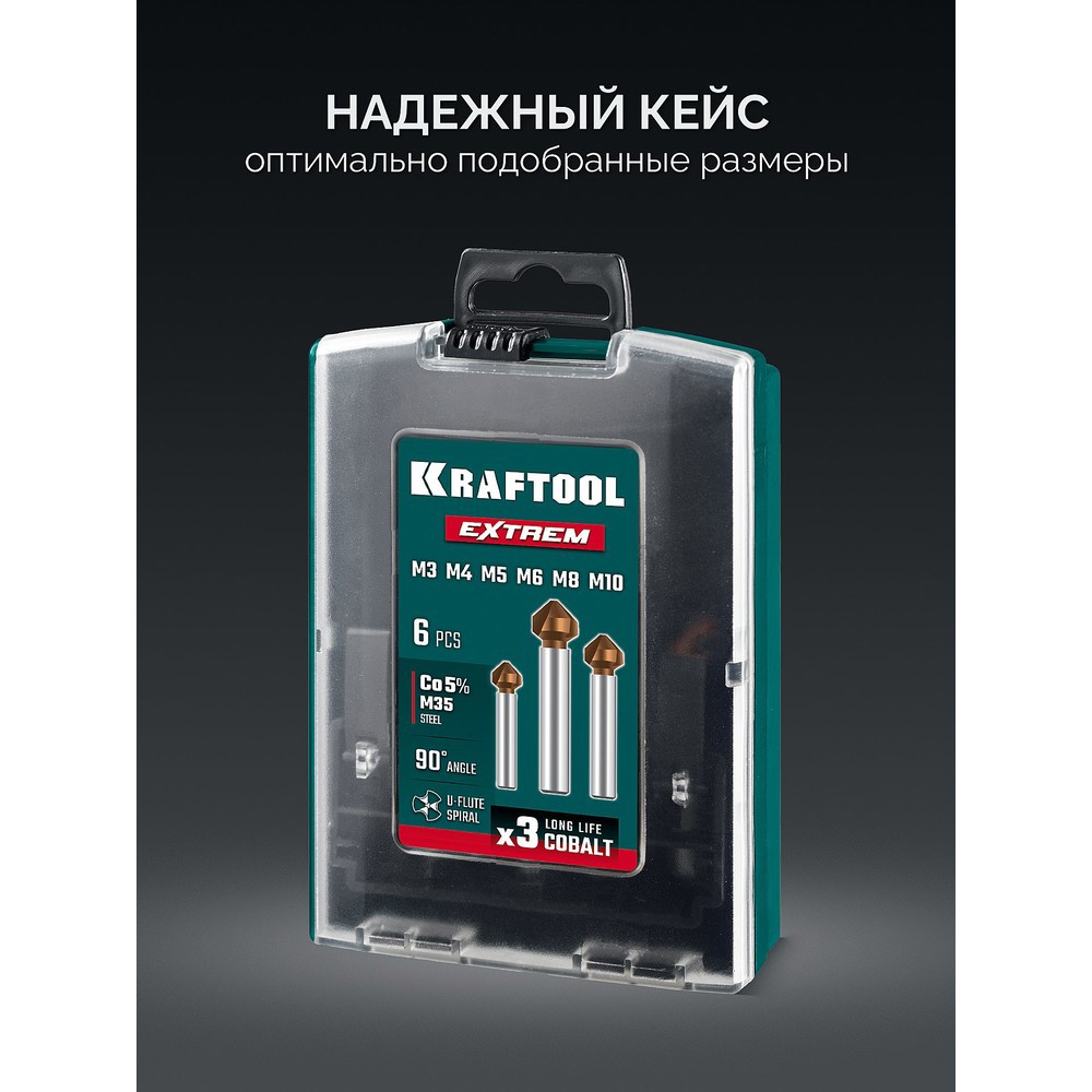 KRAFTOOL EXTREME Со5-А, 6 шт (М3-М10), сталь M35, U-образная спираль, Набор зенкеров (29734-H6)