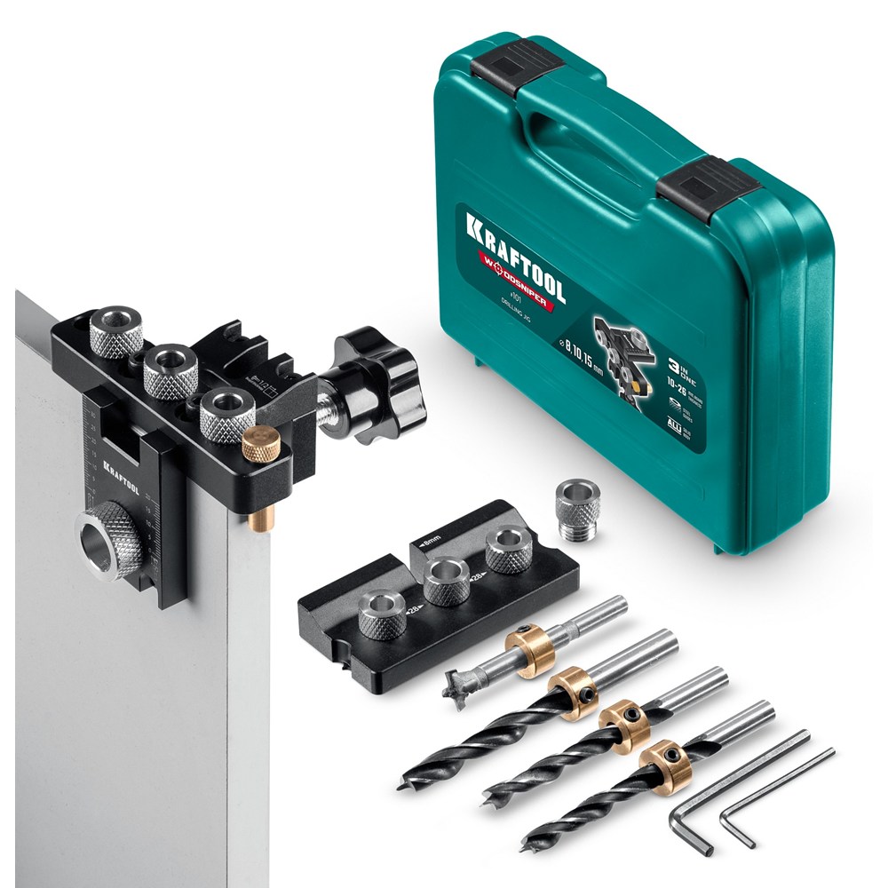 KRAFTOOL Woodsniper 101, ″3-в-1″ кондуктор для эксцентриковых стяжек и шкантов (30072)