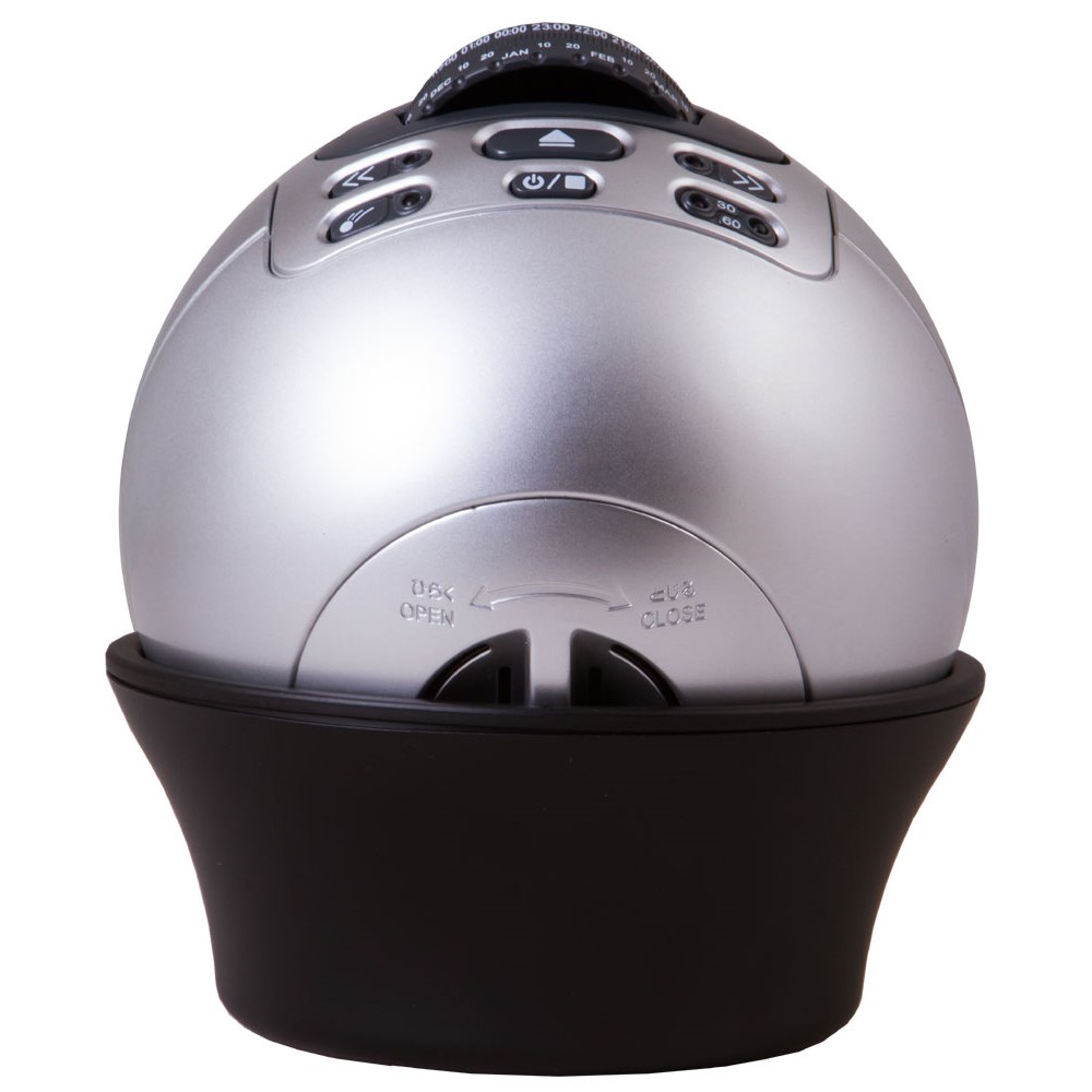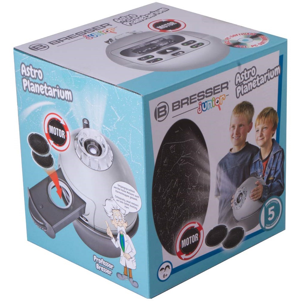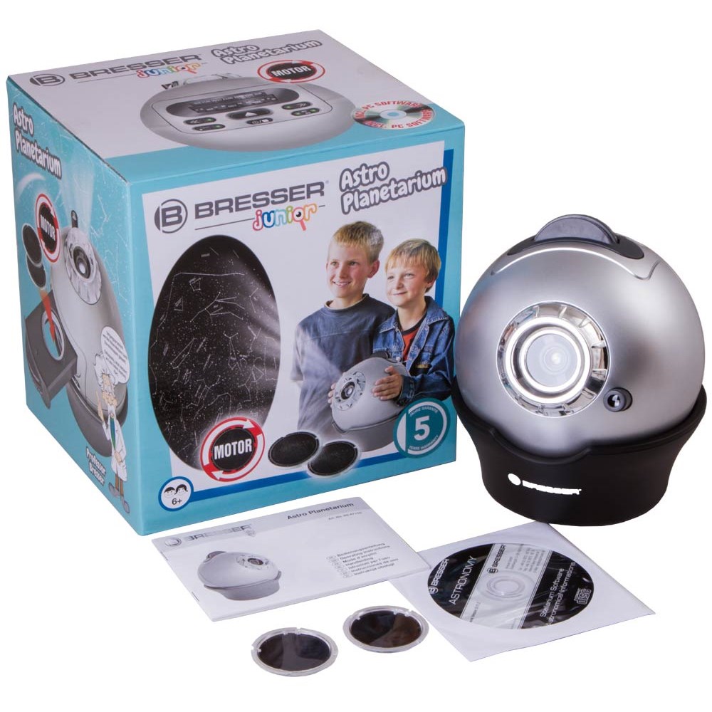 Астропланетарий Bresser Junior содержит информацию о 8000 звезд и 61 созвездии. Моделирует суточное вращение небесной сферы, проецирует линии созвездий и имитирует «падающие звезды». Питание прибора осуществляется от 3 батареек, есть функция выключения в заданное время. Астропланетарий не только обеспечивает визуальный эффект присутствия под ночным небом, но и ненавязчиво дает новые знания. В комплекте планетарий: пластиковая проекционная сфера подставка: для горизонтальной/вертикальной ориентации сферы слайды звездного неба: 2 шт.