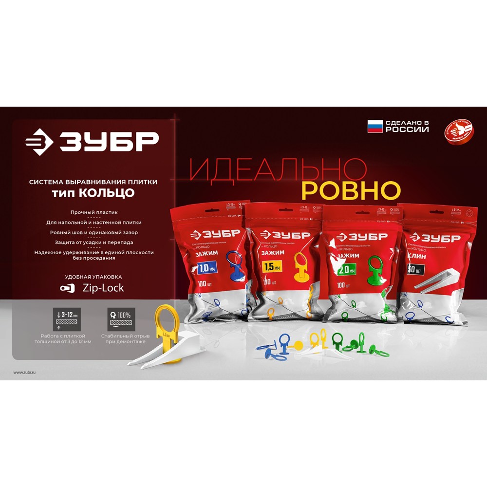 Сделан из прочного пластика, он не деформируется при зажимании и надежно удерживает плитку в единой плоскости, обеспечивая отсутствие проседания во время высыхания плиточного клея. Позволяет работать с плиткой толщиной от 3 до 12 мм.