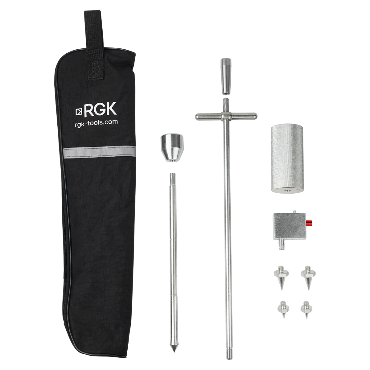 Для работы с различными материалами динамический плотномер RGK ДПУ оборудуется съемным рабочим узлом. Для сыпучих материалов и грунта используется стержень с наконечником, а для асфальтобетонных смесей – конусная насадка на ограничителе. Оценка качества укладки асфальтобетона может производиться в горячем состоянии в процессе выполнения работ, а также через несколько суток, после полного остывания материала. Для этих целей инструмент оснащается сменными конусами двух типоразмеров, отличающихся высотой. Предельное заглубление заостренного элемента в поверхность покрытия фиксируется механизмом с пружинным затвором, который встроен в ограничитель, что минимизирует риск субъективных ошибок пользователя.