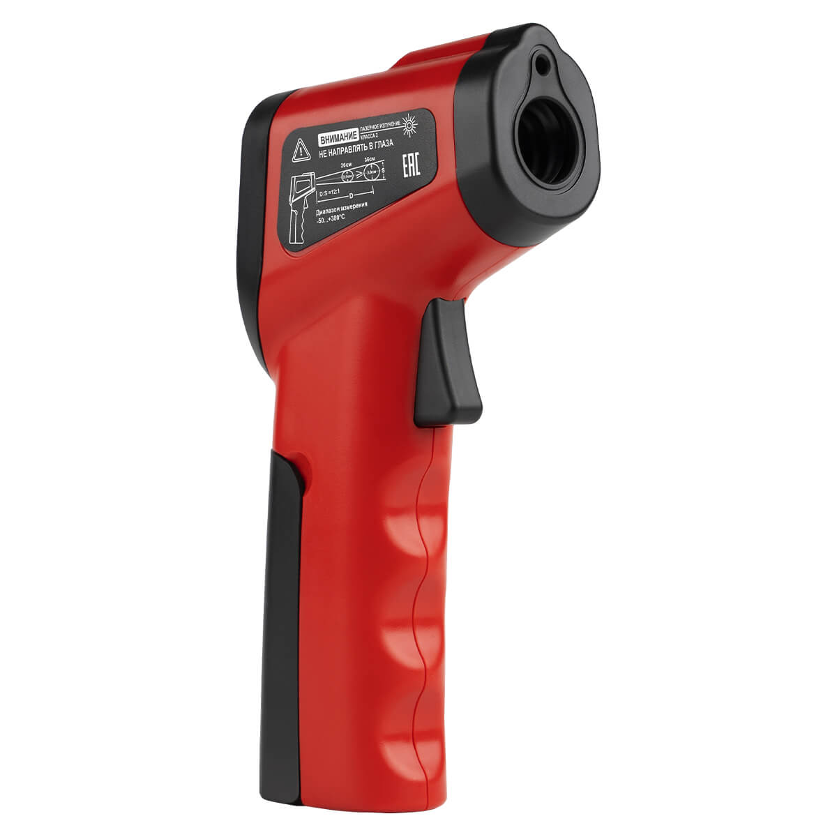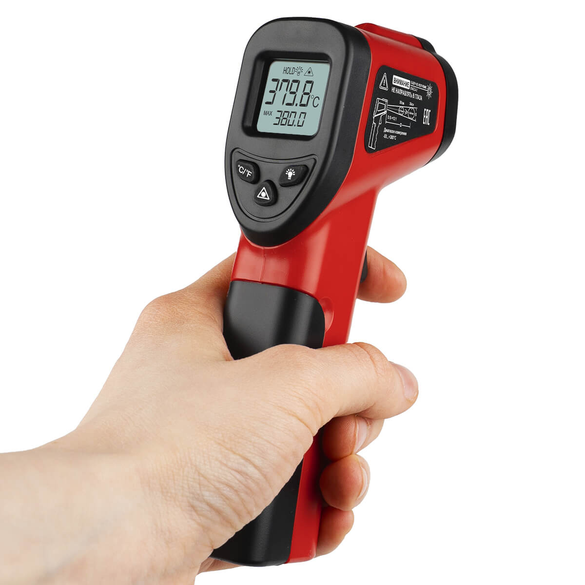 Пистолетный форм-фактор, с курковым механизмом на ручке, который служит для запуска процесса измерений, и кнопками управления дополнительными функциями обеспечивает возможность комфортного выполнения всех действий с прибором одной рукой, упрощая проведение замеров в труднодоступных местах. Лазерный указатель позволяет точно наводить пирометр на выбранный объект, визуально контролируя местоположение измерительной зоны. Функция HOLD, которая активируется автоматически после отпускания курка на рукоятке, фиксирует текущие цифровые показания на дисплее, что облегчает считывание результатов измерений.