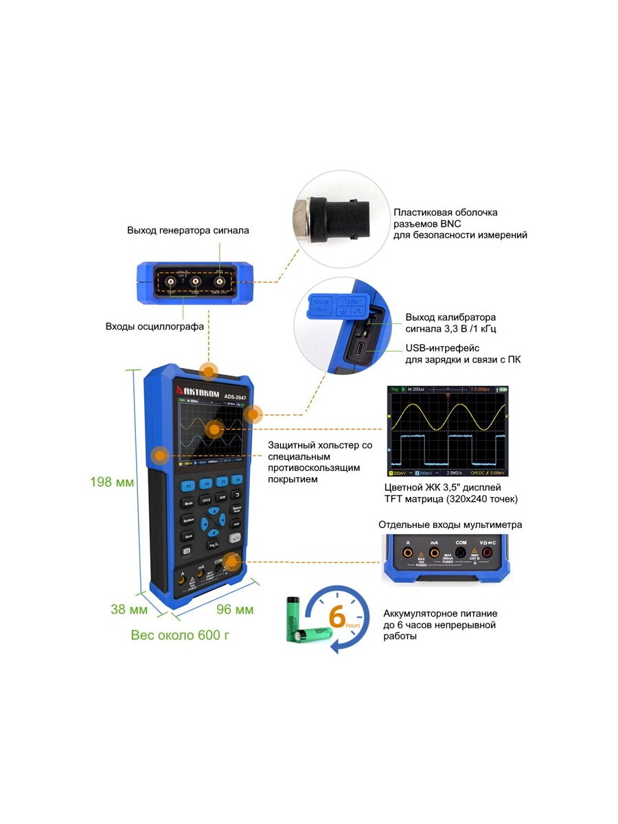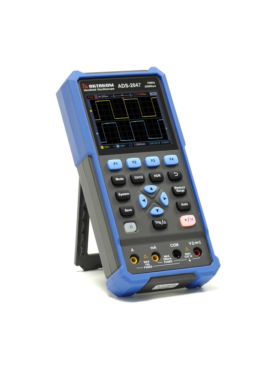 Портативный прибор Актаком ADS-2047 сочетает в одном корпусе 3 измерительных устройства: двухканальный цифровой осциллограф, 4 1/2 - разрядный TrueRMS мультиметр и генератор сигналов специальной формы.