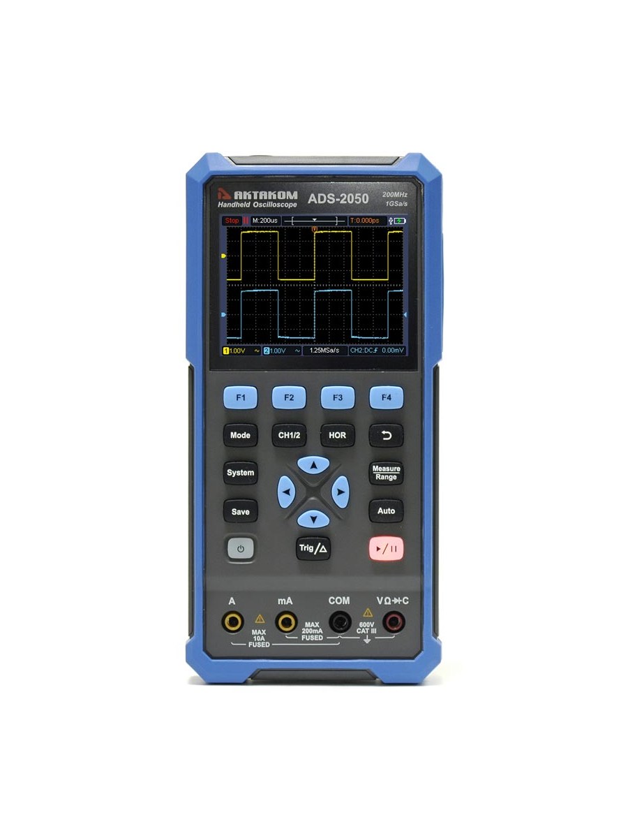 Портативный прибор ADS-2050 сочетает в одном корпусе 2 измерительных устройства: двухканальный цифровой осциллограф и 4 1/2 - разрядный TrueRMS мультиметр.