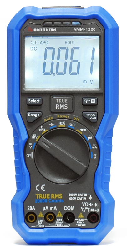 Цифровой мультиметр с TrueRMS (1 кГц). ЖКИ 4 1/2 разряда (20000 отсчётов) с подсветкой. Постоянное напряжение 1000 В ±(0,05%); переменное напряжение 750 В ±(0,5%); постоянный ток 20 А ±(0,5%); переменный ток 20 А ±(0,8%); сопротивление 60 МОм ±(0,3%); ёмкость 20 мФ ±(3,0%); частота 20 МГц ±(0,1%); коэффициент заполнения, температура -50 - 400 °C ±(2,5%); тест диодов; прозвонка. Бесконтактный датчик напряжения. Относительные измерения. Удержание показаний. Авто и ручной выбор диапазона. Автоотключение. Защита от перегрузок 600 В, CATIV / 1000 В, CATIII. Питание 9 В (Крона). Размеры 196x88.5x56 мм. Масса 320 г.