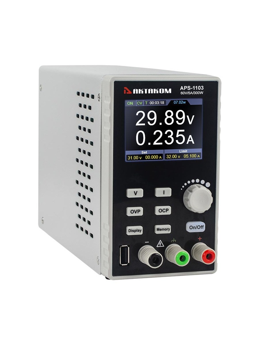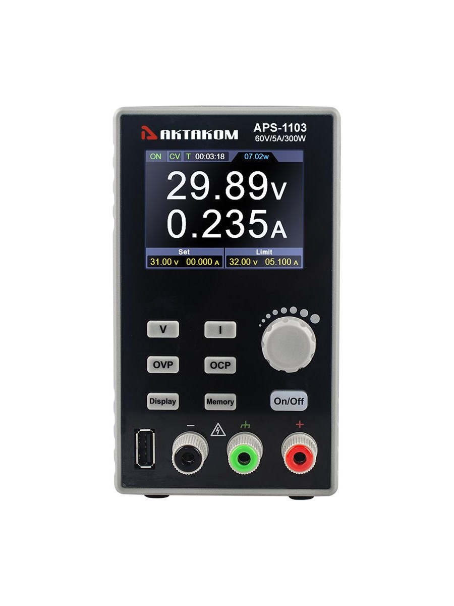 1 канал. Импульсный. Программируемый. Выходное напряжение / ток: 0…60 В / 0...5 А. Максимальная мощность 300 Вт. Выход USB 5 В/1 А. Разрешение (установка/считывание) 10 мВ/1 мА. Пульсации/шум 30 мВскз/30 мАскз. Кнопка включения/отключения нагрузки. Функция мониторинга. Работа по списку 10 групп. Сохранение 4 групп. Защита OVP, OCP с заданием. 2,8 " ЖК индикатор. Интерфейс USB. SCPI команды. Размеры 82 x 142 x 226 мм.