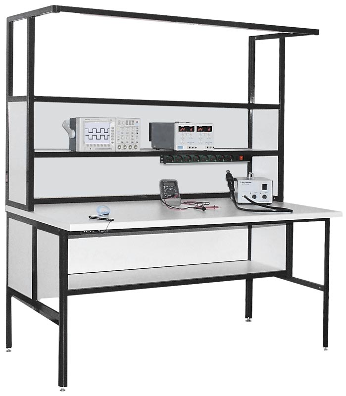 АКТАКОМ АРМ-4210 стол регулировщика радиоаппаратуры 100 х 80 х 171 см. Цвет алюминиевого каркаса - коричневый (RAL-8017), цвет ДСП - белый. Две полки 100 х 30 см с задней стенкой над столешницей. Одна полка 100 х 30 см с глухой задней стенкой под столешницей. Кронштейн-штанга по всей ширине стола. Светодиодный светильник 10 Вт, блок из 8 розеток с выключателем, разъемы заземления.