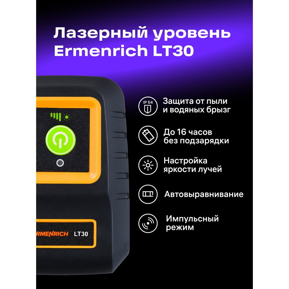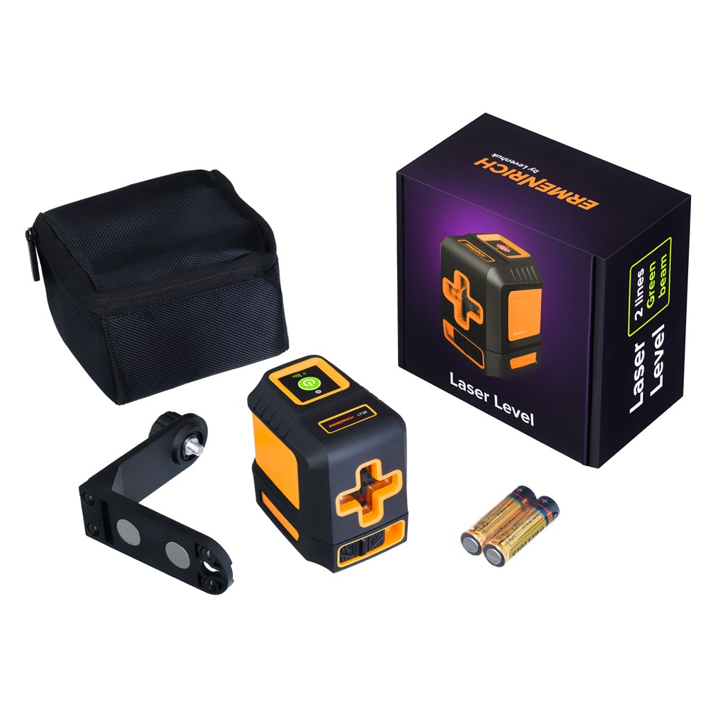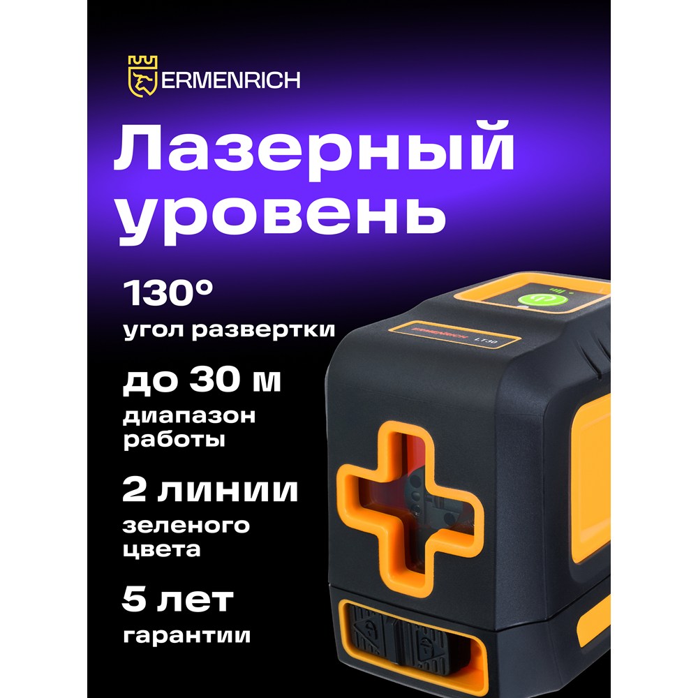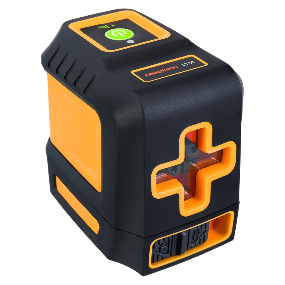 Представляем Ermenrich BASE LT30 – лазерный уровень для выравнивания поверхностей и других работ на строящихся и ремонтируемых объектах. Он проецирует крест из двух линий зеленого цвета и может находиться на достаточно большом расстоянии от поверхности – до 30 метров. Угол развертки составляет 130 градусов в обеих плоскостях, горизонтальной и вертикальной. Яркость можно регулировать. За питание лазера отвечает пара стандартных пальчиковых батареек.