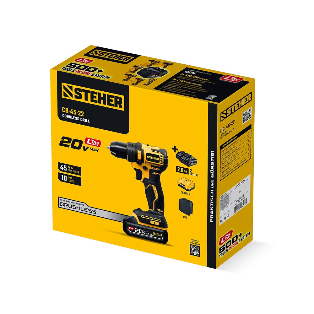 STEHER 20 В, 45 Н·м, 2 АКБ LMS (2 А·ч), бесщеточная дрель-шуруповерт, сумка (CB-45-22)