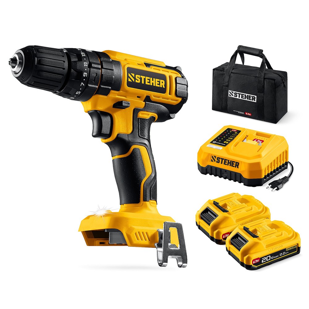 STEHER 20 В, 40 Н·м, 2 АКБ LMS (2 А·ч), ударная дрель-шуруповерт, сумка (CDS-40-22)