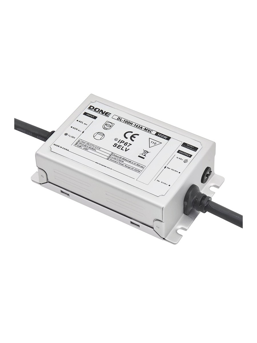 AC-DC, 75...100Вт, стабилизатор тока,IP67, вход 200...277В АС, 47…63Гц, ККМ,выход 0.5...1.05A/71...143В, изоляция 3750В AC, в кожухе 105*63*30,-40…+90°С (корпус), встр. потенциометр, гарантия 5 лет
