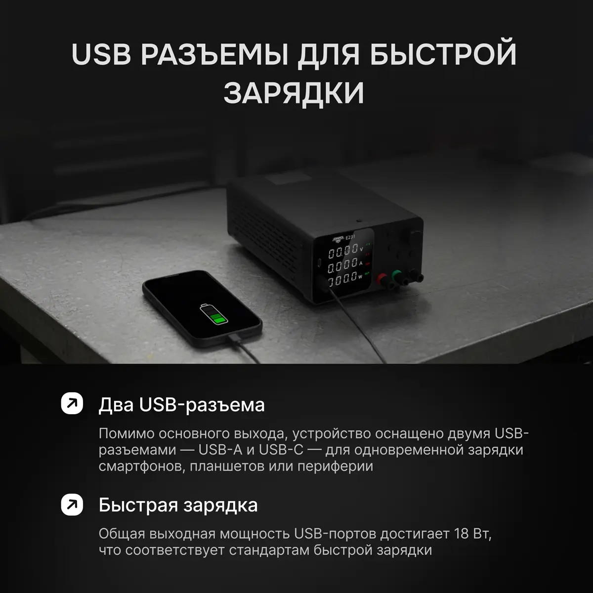 - Автоматический переход между режимами стабилизации напряжения (CV) и тока (CC)