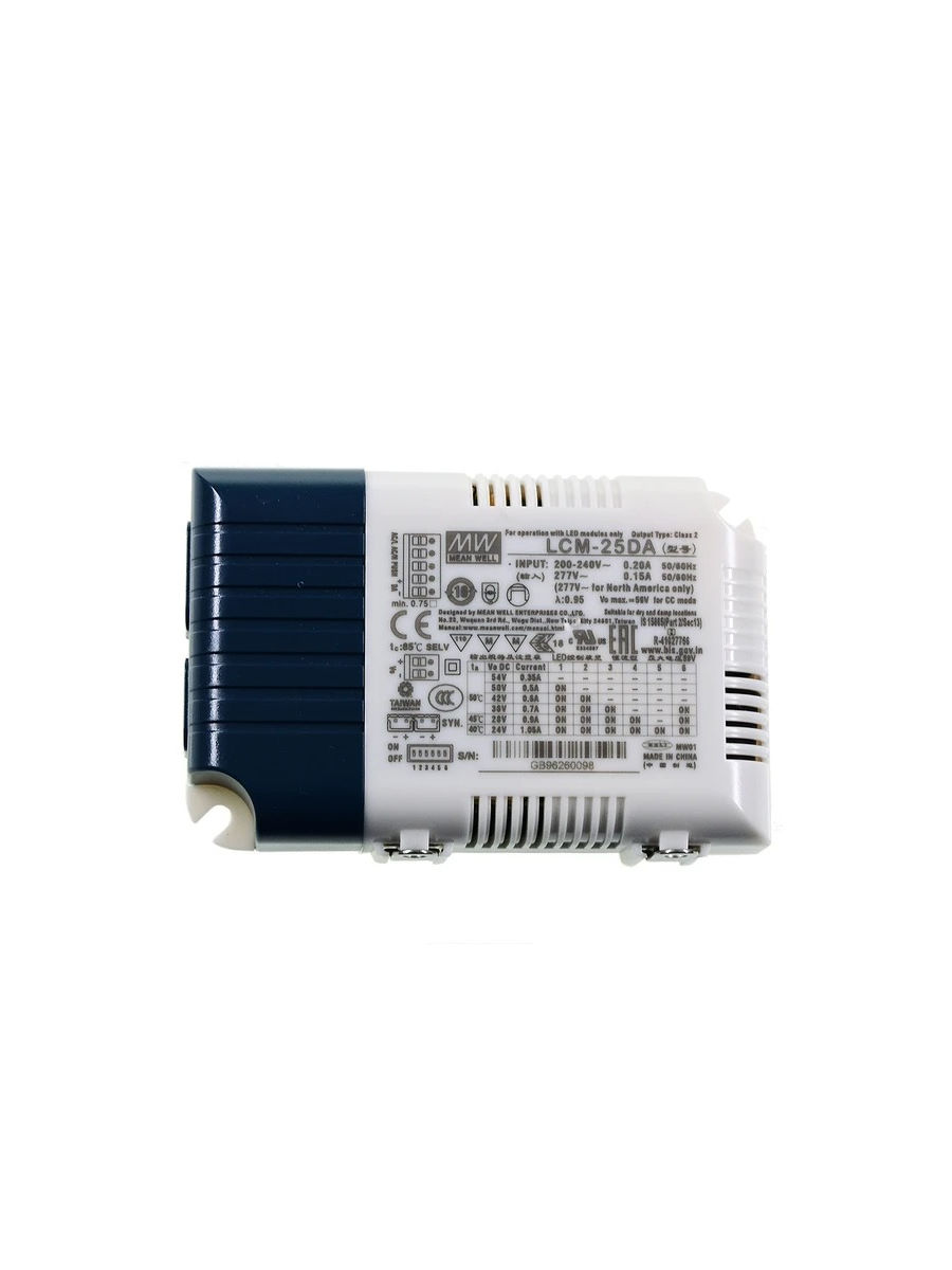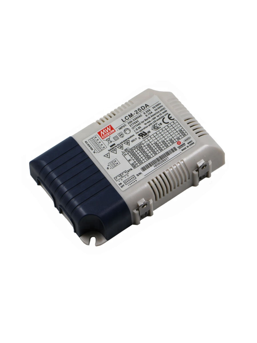 Источники питания для светодиодного освещения серии LCM-25 с выходной мощностью 25 Вт. Данная серия отличается возможность выбора нужного тока посредством встроенного DIP-переключателя. Значение тока можно выбрать из следующего ряда: 350, 500, 600, 700, 900, 1050 мА. Источники питания LCM-25 выполнены по схеме двухкаскадного преобразования с коррекцией коэффициента мощности (λ>0.94), обладают низкими пульсациями тока и имеют возможность диммирования. Диммирование может осуществляться либо методом ШИМ и по протоколу 0…10 В (LCM-25), либо по протоколу DALI (LCM-25DA).