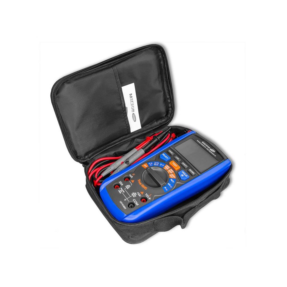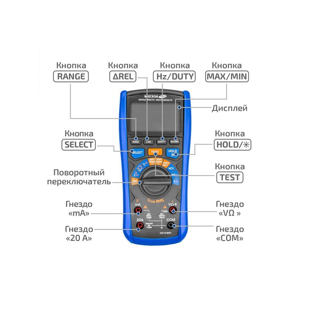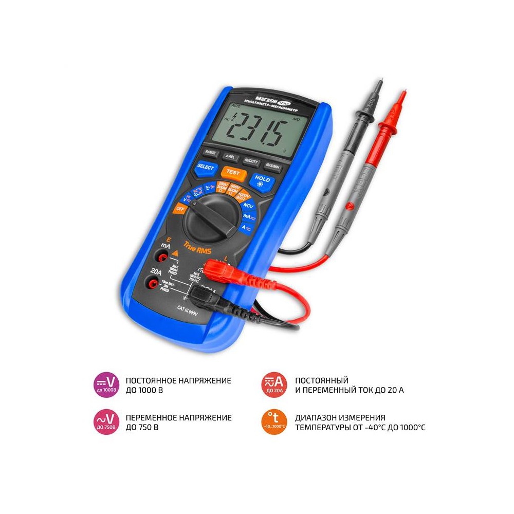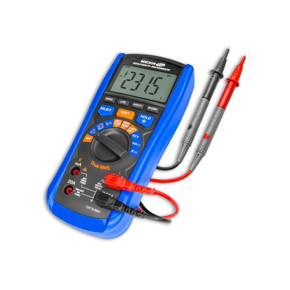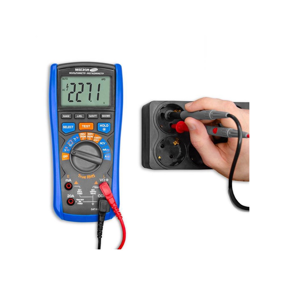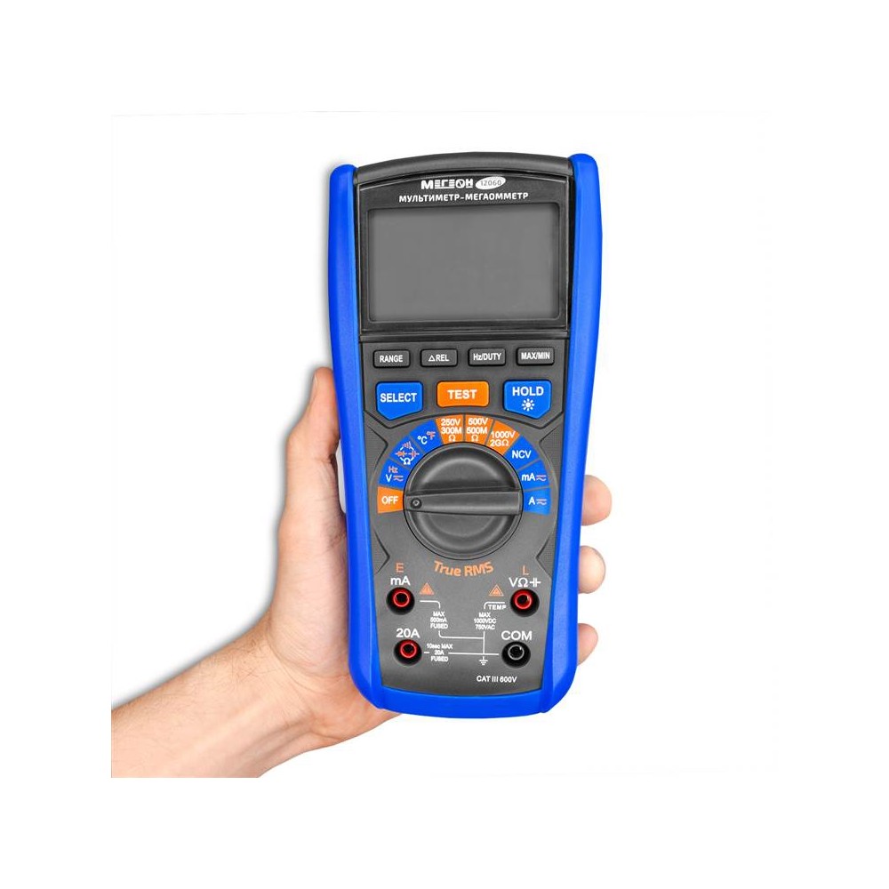 МЕГЕОН 12060 – это мультиметр-мегаоометр, котрый объединяет в одном корпусе цифровой измеритель сопротивления изоляции и цифровой мультиметр. Это обеспечивает максимальную универсальность применения как для диагностики, так и для технического обслуживания. Мультиметр измеряет переменное (TueRMS) и постоянное напряжение, переменный и постоянный ток, сопротивление, ёмкость, частоту, температуру и скважность (Duty Cycle), а также имеет функции проверки целостности цепи (прозвонка), диодного теста, бесконтактного датчика напряжения (NCV), определения максимального и минимального значения, функцию относительных измерений, подсветки дисплея, свето-звукового оповещения, удержания измеренных значений (Hold) и автоматического выключения для экономии заряда батарей. Функция мегаомметра обеспечивает измерение электросопротивления изоляционного покрытия для определения его целостности.