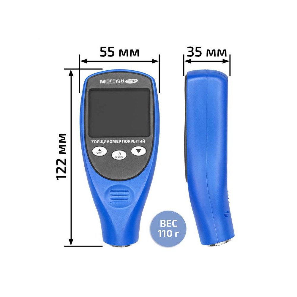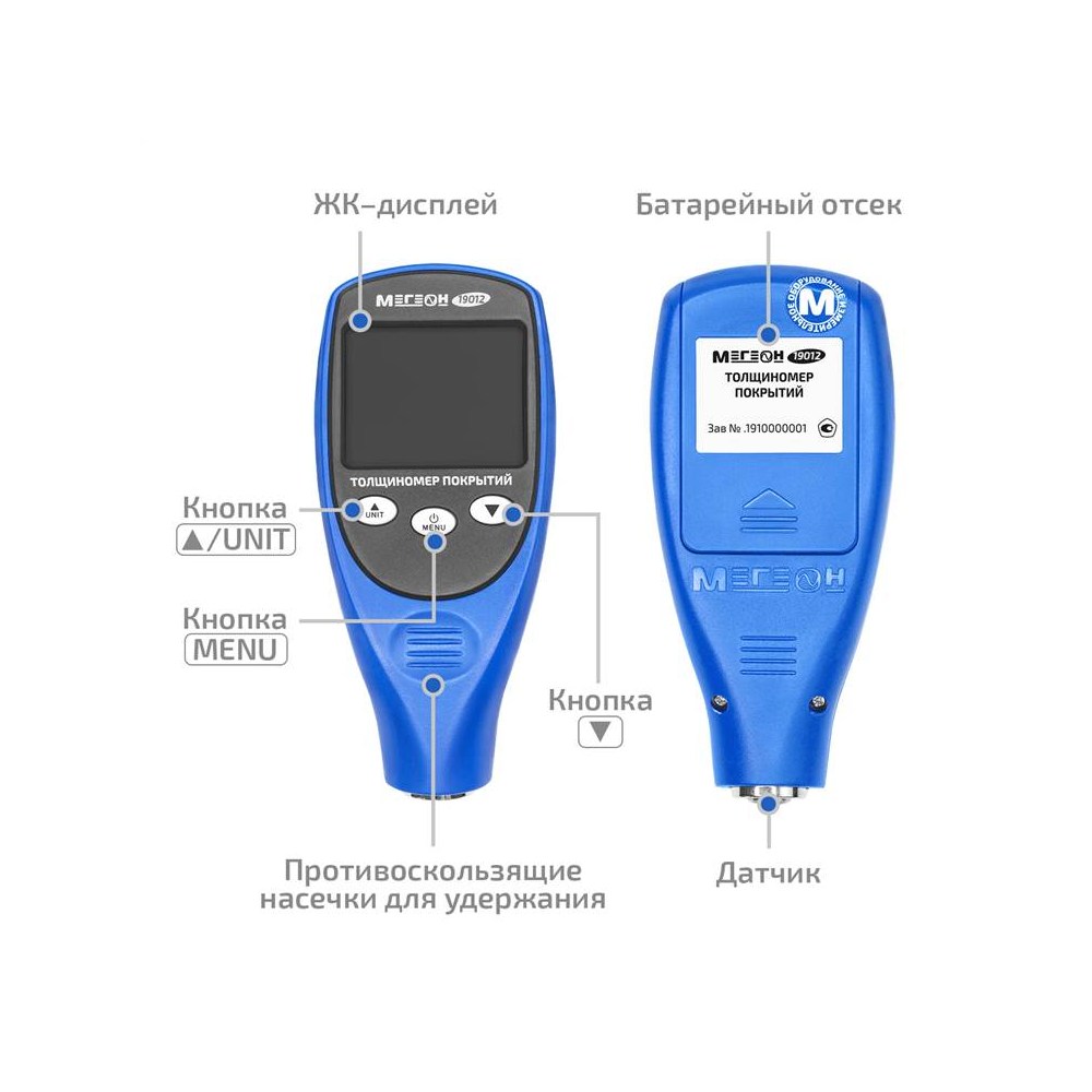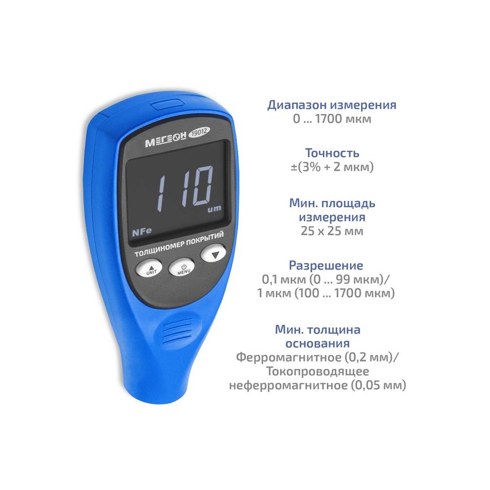 Толщиномер покрытий МЕГЕОН 19012 предназначен для измерения толщины лакокрасочных, полимерных, цинковых, медных и других покрытий на основаниях из чёрных и цветных металлов. В приборе комплексно реализовано два метода измерения – электромагнитный и вихретоковый. Выбор режима выполняется автоматически в зависимости от типа металла под покрытием – ферромагнитного или неферромагнитного. Первым включается электромагнитный режим, а при отсутствии в пределах видимости ферромагнитного материала прибор переключается на вихретоковый режим для обнаружения неферромагнитного основания. В обоих случаях толщиномер измеряет расстояние от датчика до металлического основания. С его помощью можно измерить: На железе – толщину слоя диэлектрика, токопроводящего немагнитного материала или их суммарную величину при комбинированном нанесении. Например, слой цинка на неокрашенном кровельном железе или общую толщину цинка с дополнительно нанесённым полимером. На цветных металлах – толщину покрытия из диэлектрических материалов. К примеру, слой краски на алюминиевом листе. Список можно дополнить полиэтиленовой плёнкой, фольгой, скотчем, бумагой и другими тонкими немагнитными материалами при наложении их на подходящую подложку. Результаты отображаются на контрастном жидкокристаллическом дисплее, сохраняются в память для последующего анализа и обрабатываются функциями вычисления максимального, минимального и среднего значений. Для повышения точности в программном обеспечении предусмотрена пользовательская калибровка по 6 точкам или по своему образцу, а в комплекте поставляется калибровочный набор. Толщиномер МЕГЕОН 19012 может успешно применяться для контроля качества окраски металлоконструкций на производстве и в строительстве, для поиска следов ремонта кузовных деталей при оценке автомобилей и во многих других сферах.